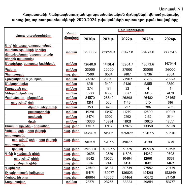 Հայաստանի Հանրապետությունում գյուղատնտեսական մթերքների վերամշակումից ստացվող արտադրատեսակների 2020-2024 թվականների արտադրության ծավալները ներկայացված են N 1 աղյուսակում:
