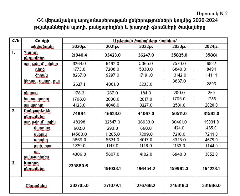 Հանրապետության վերամշակող արդյունաբերության ընկերությունների կողմից 2020-2024 թվականներին պտղի, բանջարեղենի և խաղողի գնումների ծավալները ներկայացված են N 2 աղյուսակում: