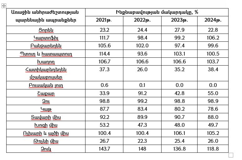 Համաձայն ՀՀ ազգային պարենային հաշվեկշռի 2021-2024 թվականներին առաջին անհրաժեշտության պարենային ապրանքների ինքնաբավության մակարդակները կազմել են՝