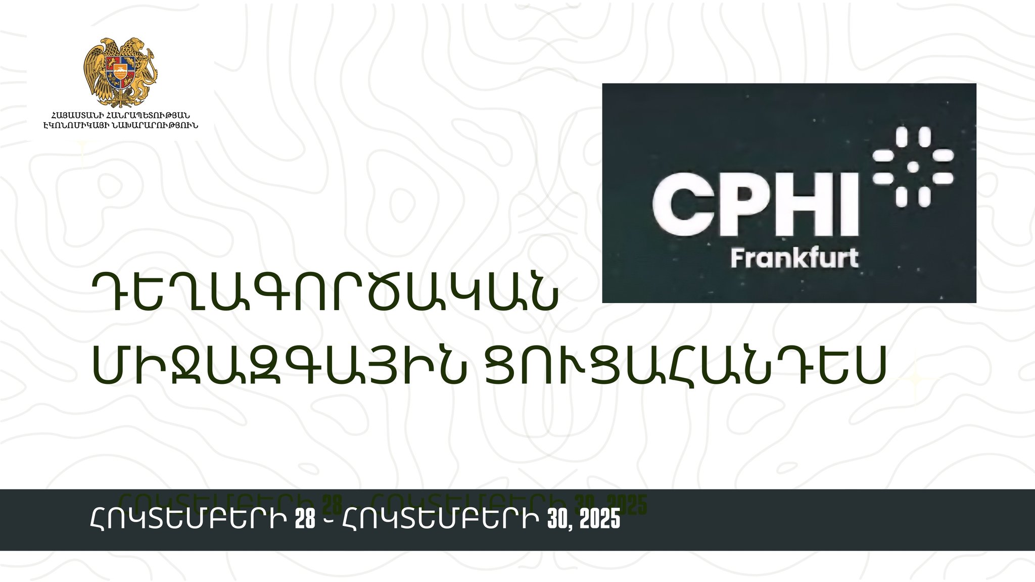 2025 թվականի հոկտեմբերի 28-30-ը Գերմանիայի Դաշնային Հանրապետության Ֆրանկֆուրտ քաղաքում կկայանա «CPHI Worldwide 2025» դեղագործական միջազգային ցուցահանդեսը։