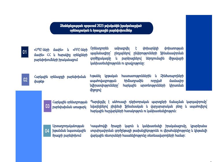 2025 թվականին ՀՀ Էկոնոմիկայի նախարարության կողմից պետություն–մասնավոր երկխոսությունն իրականացվել է մի քանի ուղղություններով։ Մասնավորապես՝ ՓՄՁ զարգացման խորհրդի և ենթախորհրդի շրջանակներում շարունակվել են շարունակական աշխատանքներն ու քննարկումները։ Բացի այդ, նախարարության նախաձեռնությամբ և տեղական ինքնակառավարման մարմինների, ինչպես նաև գործընկեր կազմակերպությունների աջակցությամբ 2025 թվականի հունիս–օգոստոս ամիսներին կազմակերպվել են մարզային այցեր Հայաստանի տարբեր համայնքներ։