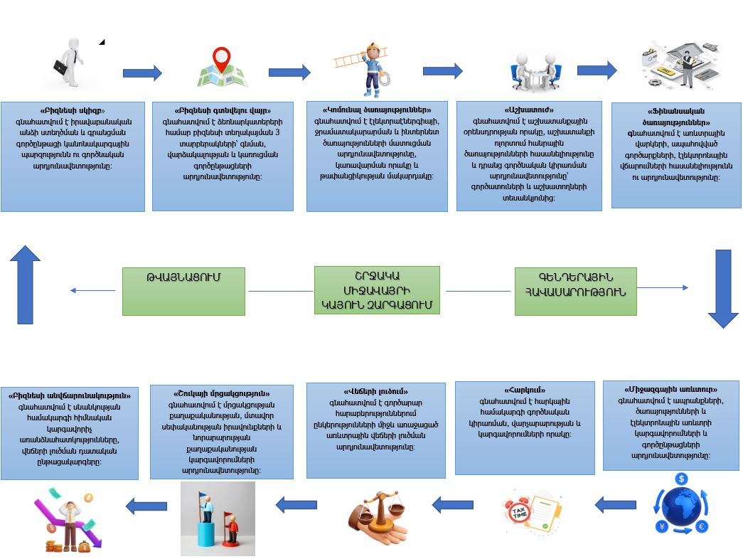 Հայաստանի Հանրապետության տնտեսական զարգացման համար կարևորագույն նախապայմաններից է գործարար և ներդրումային միջավայրի բարելավումը, և դրան հասնելու համար Կառավարությունը նպատակ ունի Հայաստանում ստեղծել ձեռնարկատիրական գործունեության պետական կարգավորումների, ծառայությունների և վարչարարական ընթացակարգերի պարզ, թափանցիկ և քիչ ծախսատար միջավայր, հավասար մրցակցային պայմաններ, գործարարությանն օժանդակող զարգացած շուկայական ենթակառուցվածքներ, ինչպես նաև իրականացնել հարկային և մաքսային հավասարակշռված քաղաքականություն: