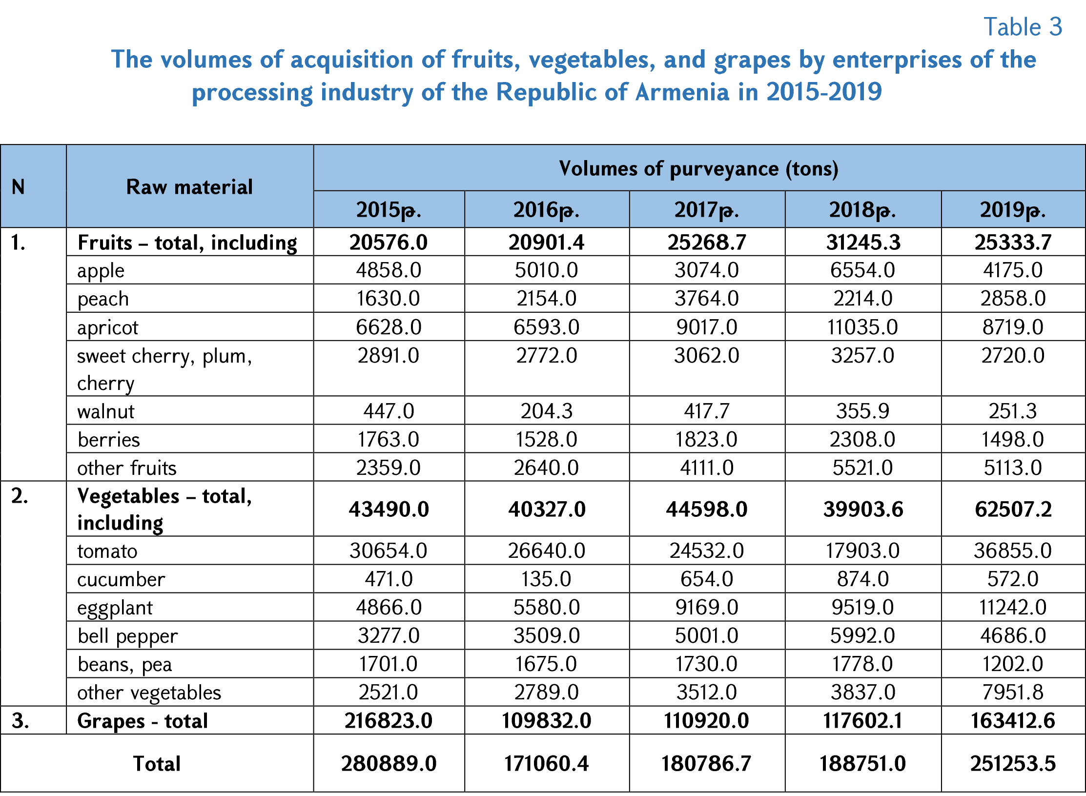 The volumes of acquisition of fruits, vegetables, and grapes by enterprises of the processing industry of the Republic of Armenia in 2015-2019 are presented in Table 3.