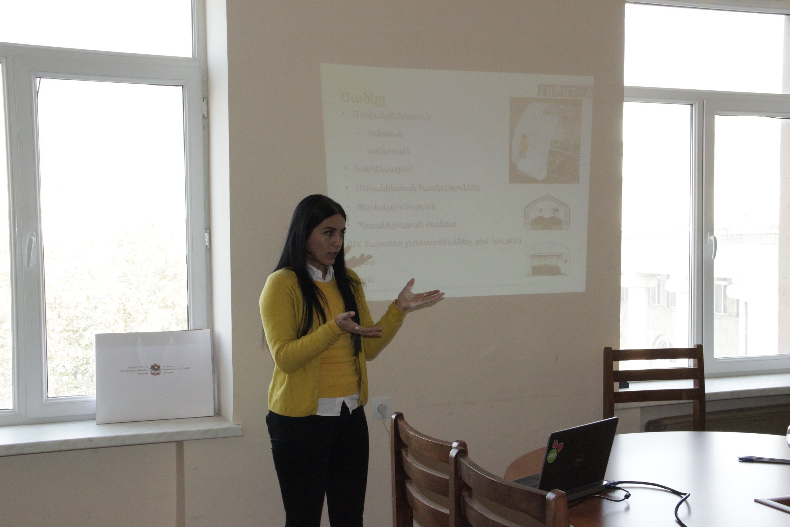 Արարատի մարզում նոյեմբերի 15-ին կազմակերպվել է ‹‹Նորագույն տեխնոլոգիաներով ջերմատնային հիմնում և արդյունավետ կառավարում՝ հողախառնուրդի և հիդրոպոնիկայի կիրառմամբ›› թեմայով վերապատրաստման դասընթաց ՀՀ էկոնոմիկայի նախարարության գյուղատնտեսական խորհրդատվության, նորարարությունների և մոնիթորինգի վարչության Արարատի և Արմավիրի բաժինների խորհրդատուների համար, որը վարել է ՀՀ էկոնոմիկայի նախարարի խորհրդական Սյուզաննա Հովսեփյանը: