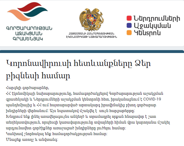 ՀՀ էկոնոմիկայի նախարարությունը, համագործակցելով Գործարարության աջակցման գրասենյակի և Ներդրումների աջակցման կենտրոնի հետ, իրականացնում է COVID-19 պանդեմիայից և Հայաստանի Հանրապետությունում հայտարարված արտակարգ իրավիճակից բխող գործարար խնդիրների վերհանում: Այս նպատակով մշակվել է սույն հարցաթերթը: