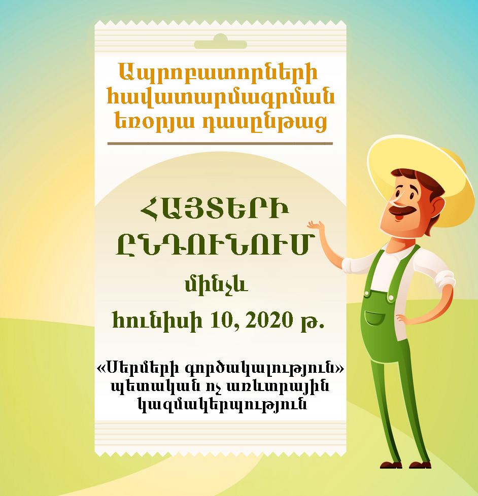 Դասընթացի մասնակցության հայտերն ընդունվում են 2020 թվականի մայիսի 27-ից մինչև հունիսի 10-ը ներառյալ: Դասընթացի վերաբերյալ հարցերի և լրացուցիչ տեղեկությունների համար կարող եք դիմել «Սերմերի գործակալություն» պետական ոչ առևտրային կազմակերպություն (հասցե՝ Արմավիրի մարզ, գյուղ Մերձավան, Երևանյան խճուղի երկրորդ, փակուղի 6/1, հեռախոսահամար՝ 060 50 06 77 (ներքին համար՝ 13) կամ 095 50 06 77, էլեկտրոնային փոստի հասցե՝ sermer.poak@gmail.com):