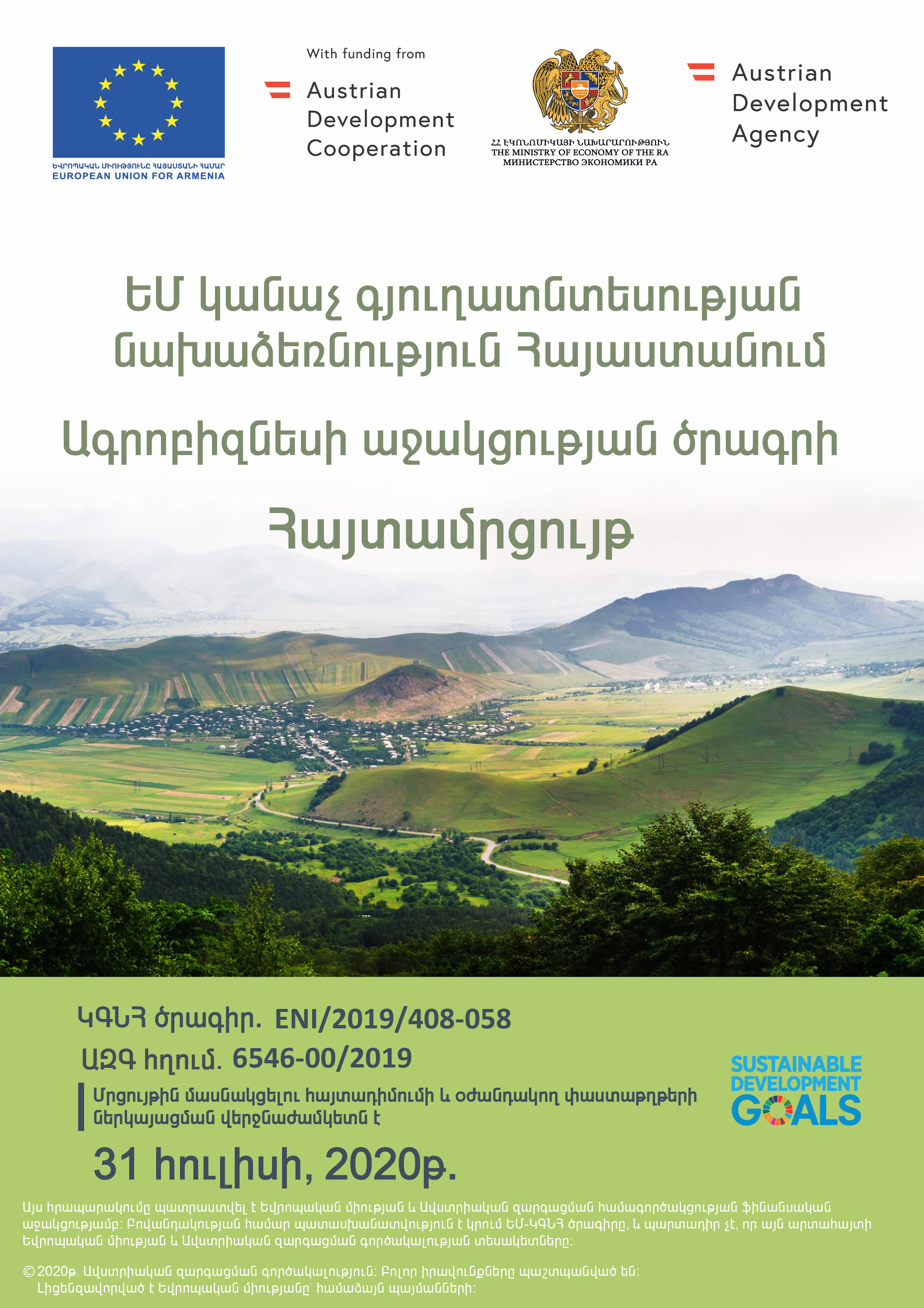 Ծրագիրը հայտարարում է կանաչ և օրգանական ագրոբիզնեսի աջակցության բաց մրցույթ եւ հայտերի հավաքագրում՝ բաղկացած 2 լոտից.