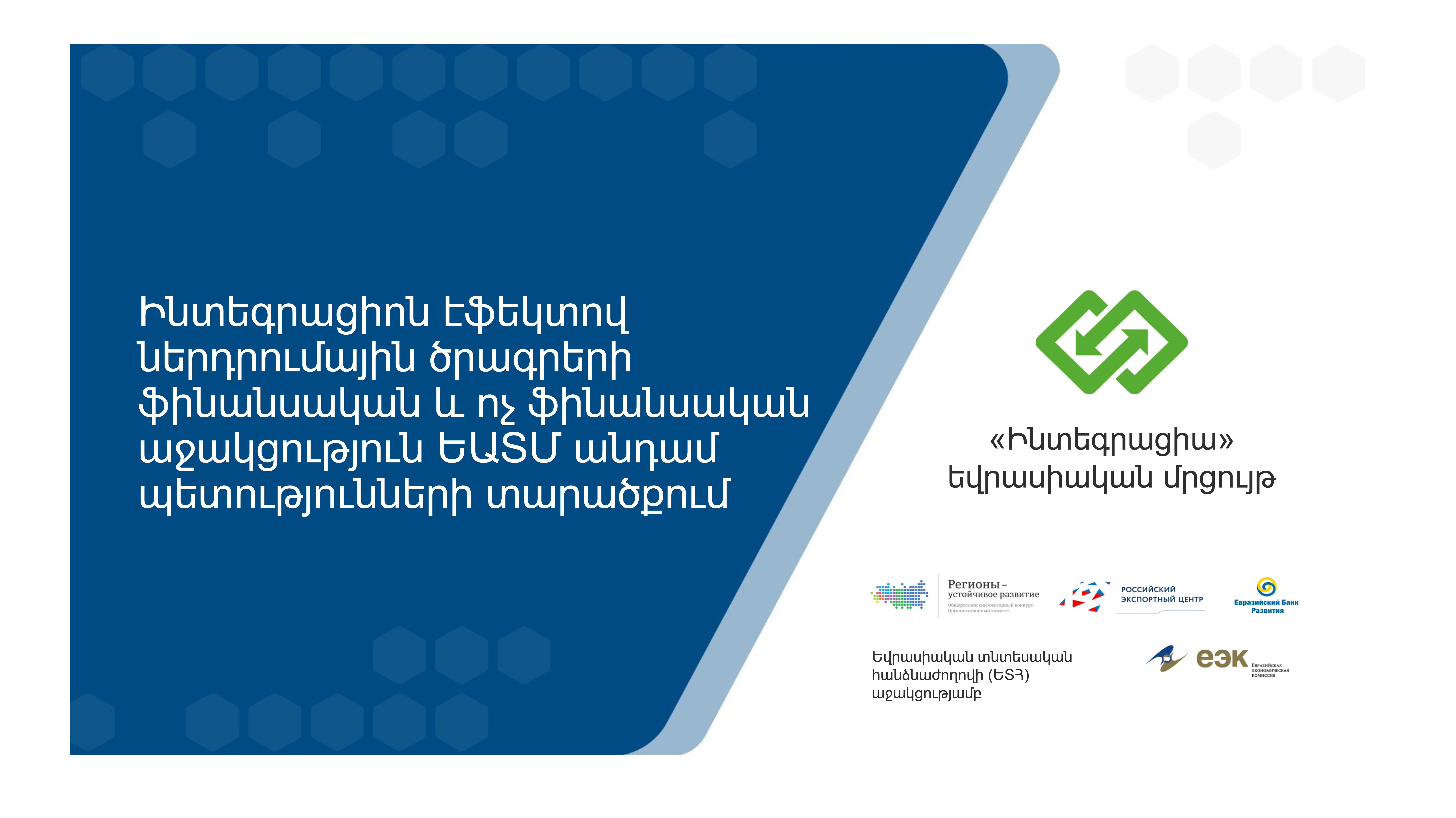 Ծրագրով ԵԱՏՄ անդամ պետությունների (Ռուսաստան, Հայաստան, Ղազախստան, Բելառուս, Ղրղզստան) տարածքներում կաջակցեն համատեղ (ինտեգրացիոն) ծրագրերի նախաձեռնմանը՝ ֆինանսավորման և ոչ ֆինանսական գործիքակազմով «Ինտեգրացիա» Եվրասիական մրցույթի հարթակում։ Հայտերը (հայտի ձևը՝ ռուսերենով) և համատեղ ծրագրերը եվրասիական ձեռներեցներից ընդունվում են Մրցույթի Կազմկոմիտեի կողմից յուրաքանչյուր տարի գարնանային (մարտի 1-ից մայիսի 30-ը) և աշնանային (սեպտեմբերի 1-ից հոկտեմբերի 30-ը) ընտրափուլերի շրջանակներում։