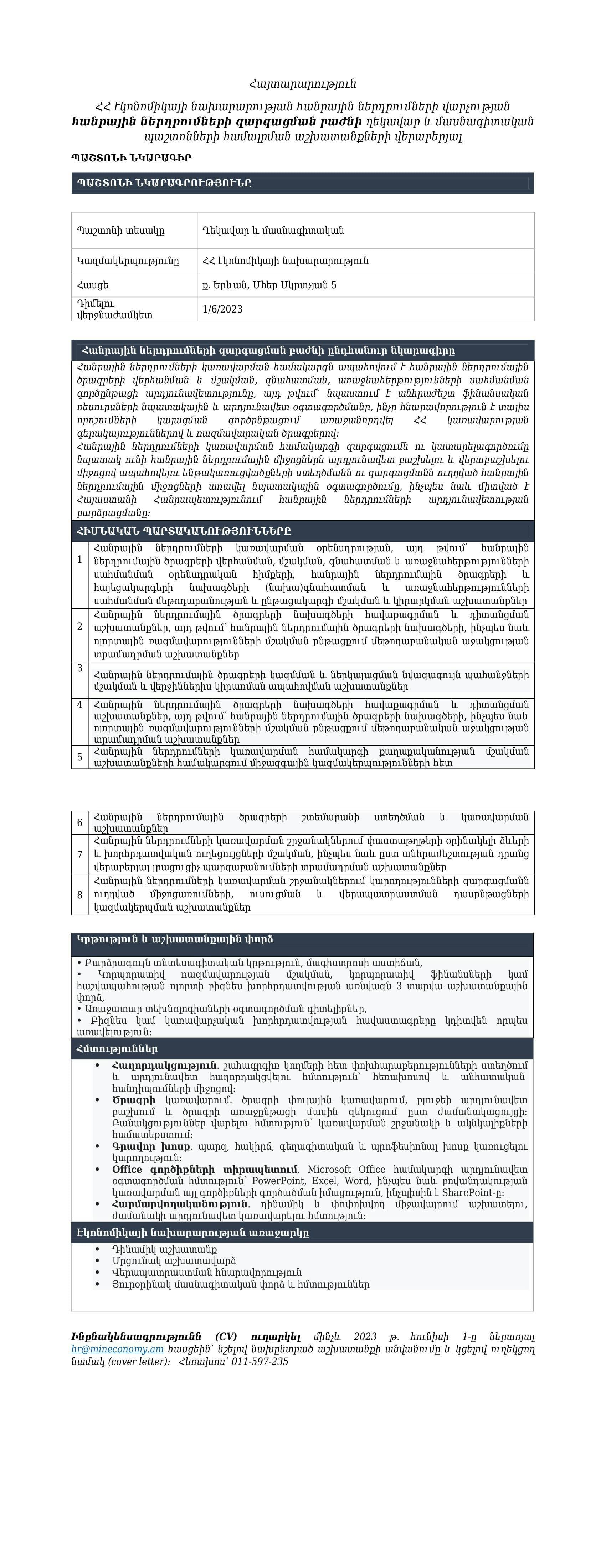 Հայտարարություն հանրային ներդրումների վարչության հանրային ներդրումների զարգացման բաժնի ղեկավար և մասնագիտական պաշտոնների համալրման աշխատանքների վերաբերյալ