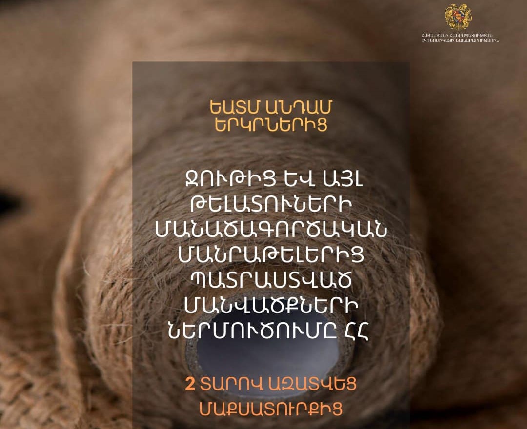 ՀՀ կառավարության 2024 թվականի հուլիսի 18-ի N 1119-Ն որոշմամբ սահմանվել է ԵԱՏՄ ԱՏԳ ԱԱ 5307 10 000 0 և 5307 20 000 0 ծածկագրերին դասվող ջութը մանրաթելերից կամ 5303 ապրանքային դիրքում ընդգրկված այլ թելատուների մանածագործական մանրաթելերից մանվածքների՝ Հայաստանի Հանրապետության տարածք «Բացթողում՝ ներքին սպառման համար» մաքսային ընթացակարգով ներմուծման թույլատվություն 0 տոկոս ներմուծման մաքսատուրքի դրույքաչափի կիրառմամբ՝ յուրաքանչյուր տարվա համար 1 տոննայից ոչ ավելի ծավալով։