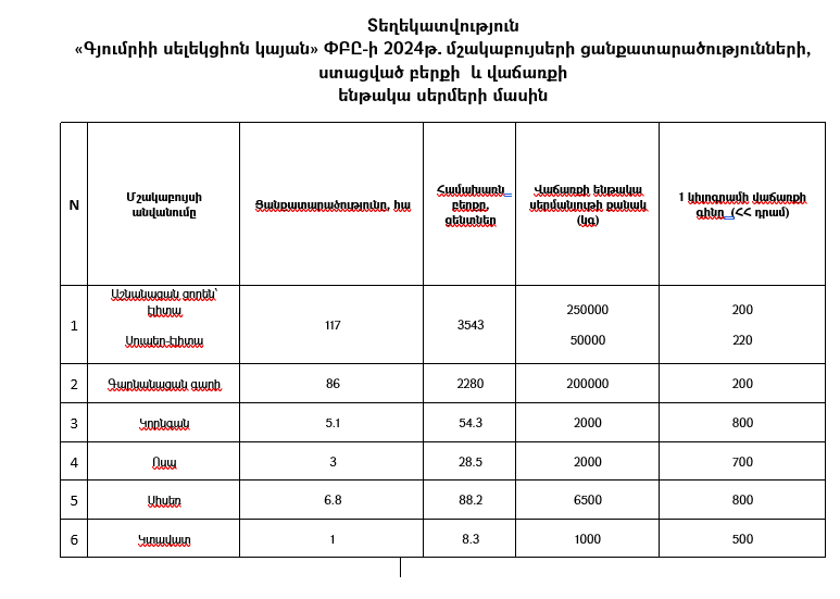 2024 թվականին ընկերությունում իրականացվել է աշնանացան ցորենի 354․3 տոննա, գարնանացան գարու 228․0 տոննա, հատիկաընդեղեն մշակաբույսերի սերմերի 11․6 տոննա համախառն բերք։