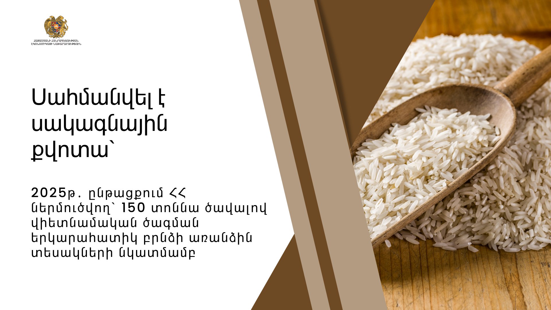 2024 թվականի հոկտեմբերի 31-ին ՀՀ կառավարության կողմից հաստատվել է «2025 թվականի ընթացքում Հայաստանի Հանրապետության տարածք Վիետնամի Սոցիալիստական Հանրապետության ծագում ունեցող երկարահատիկ բրնձի նկատմամբ սակագնային քվոտա սահմանելու, ներմուծման լիցենզիայի ընթացակարգը, մեկանգամյա և գլխավոր լիցենզիաների ձևերը հաստատելու մասին որոշումը, որով սահմանվել է 150 տոննա ծավալով սակագնային քվոտա՝ 2025թ․ ընթացքում Հայաստանի Հանրապետություն ներմուծվող վիետնամական ծագման երկարահատիկ բրնձի առանձին տեսակների (ԵԱՏՄ ԱՏԳ ԱԱ 1006 30 670 1 և 1006 30 980 1) նկատմամբ, որոնց ներմուծումը «Բացթողում` ներքին սպառման համար» մաքսային ընթացակարգի կիրառմամբ» թույլատրվում է՝ 0 տոկոս ներմուծման մաքսատուրքի դրույքաչափի կիրառման պայմանով` լիցենզիայի առկայության դեպքում: