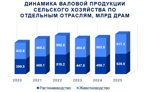 Сельское хозяйство является одной из ключевых отраслей экономики страны, обеспечивающей 7,9% ВВП (по данным за 2025 год). Около 90,8% валовой продукции сельского хозяйства обеспечивают порядка 317 тысяч хозяйств, на каждое из которых в среднем приходится около 1,48 га земельных угодий. В сельскохозяйственном секторе занято 17,6% от общего числа трудоустроенного населения Республики Армения․
